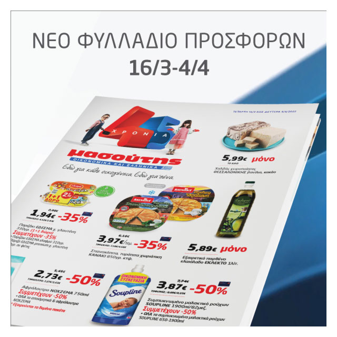 Εδώ για κάθε οικογένεια! Εδώ για σένα!! Επίλεξε από το Νέο Φυλλάδιο Προσφορών πλήθος προϊόντων, κατάλληλα για σένα και για το νοικοκυριό σου! • Προπόνηση στη σωστή διατροφή! • Γρήγορα και νόστιμα φαγητά! • Απολαυστικό πρωινό! • Όλα για τη στοματική υγιεινή! • Προσωπική περιποίηση! • Μαζί, όπου υπάρχει ανάγκη! Θα τα βρεις σε όλα τα καταστήματα λιανικής, στο site μας & στο eshop μας Ισχύει από 16/3 έως 4/4/2022 |