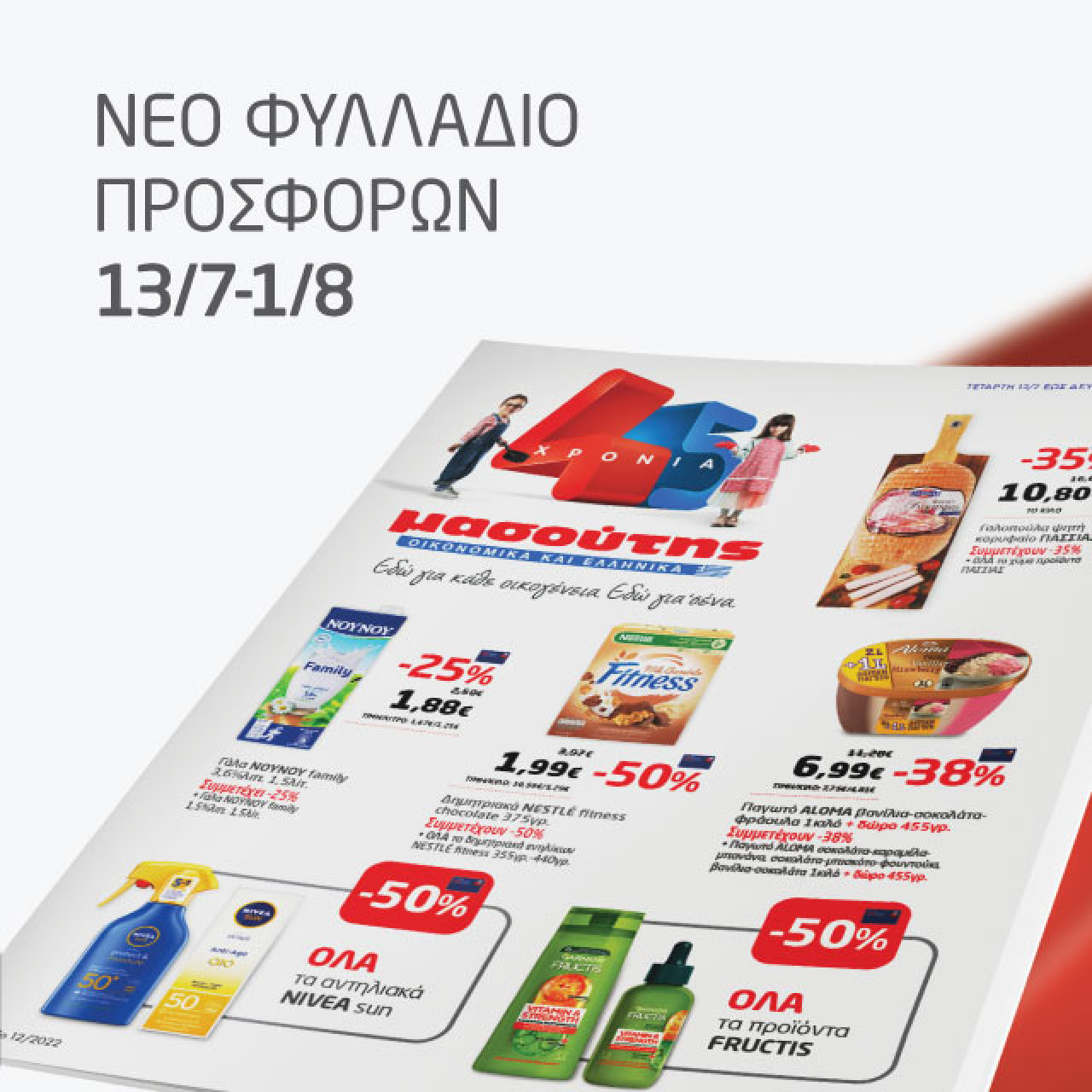 Το νέο φυλλάδιο προσφορών μας μόλις κυκλοφόρησε! Είστε έτοιμοι να γεμίσετε το καλάθι σας με τα προϊόντα που σας ταιριάζουν; • Φρέσκα φρούτα & λαχανικά! • Πρωινό γεμάτο ενέργεια! • Σνακ στη στιγμή! • Νόστιμα & γρήγορα γεύματα! • Ό, τι χρειαζόμαστε για ένα λαμπερό σπίτι! • Προϊόντα για τη θάλασσα! Εδώ για κάθε οικογένεια, εδώ για 'σένα! Που μπορείτε να βρείτε τις προσφορές μας: • Σε όλα τα καταστήματα λιανικής • Στο site μας • Στο eshop μας Ισχύει από 13/7 έως 1/8/2022 #masoutis #εδώγιασένα #zoumekalyterara #offers #45xronia_masoutis |